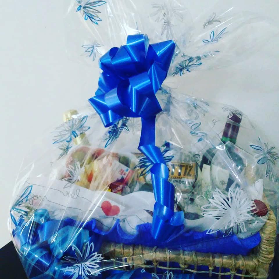 Cesta decorada, vinho tinto suave, espumante, duas taças, garrafinha de Ice, água de côco, refrigerante, queijo fatiado, batatas, salaminho, amendoin, biscoito aperitivo e arranjo de flor.